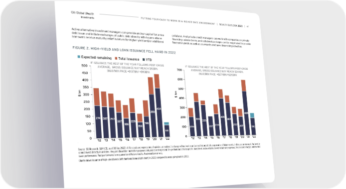 Citi Global Wealth PUTTiNG YoUr CASH To worK iN A HiGHer rATe eNviroNMeNT | | 47 Investments Active alternative investment managers can provide anchor capital for a new collateral. And private credit managers can work with companies on private debt issue and initiate exchanges of public debt directly with issuers where financings where terms and collateral packages can be negotiated to provide borrowers receive maturity relief in return for higher yield and/or additional favorable yields as well as covenants and seek downside protection. FiGUre 2. HiGH-YieLD AND LoAN iSSUANCe FeLL HArD iN 2022 Expected remaining Total issuance YTD IF ISSUANCE THE REST OF THE YEAR FOLLOWS POST-CRISIS IF ISSUANCE THE REST OF THE YEAR FOLLOWS POST-CRISIS 500 AVERAGE, GROSS ISSUANCE MAY REACH $112BN. 700 AVERAGE, GROSS ISSUANCE MAY REACH $244BN. (MAX/MIN PACE +$137BN/ +$93BN) (MAX/MIN PACE +$274BN/+$215BN) 450 600 400 350 500 $ bn300 $ bn400 250 200 404 300 358 488 150 274 267 200 405 263 366 360 100 227 225 198 333 186 158 235 237 100 205 207 207 190 50 88 0 '12 '13 '14 '15 '16 '17 '18 '19 '20 '21 '22 0 '12 '13 '14 '15 '16 '17 '18 '19 '20 '21 '22 Source: Citi Research, S&P/LCD, as of 30 Sep 2022. All forecasts are expressions of opinion, are subject to change without notice and are not intended to be a guarantee of future events. Indices are unmanaged. An investor cannot invest directly in an index. They are shown for illustrative purposes only and do not represent the performance of any specific investment. Index returns do not include any expenses, fees or sales charges, which would lower performance. Past performance is no guarantee of future results. Real results may vary. Charts shows issuance of high-yield bonds (left chart) and loans (right chart) in 2022 compared to years going back to 2012.