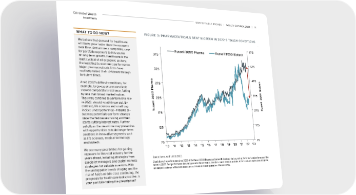 Citi Global Wealth UNSToPPABLe TreNDS | | 81 Investments wHAT To Do Now? FiGUre 3: PHArMACeUTiCALS BeAT BioTeCH iN 2022’S ToUGH CoNDiTioNS We believe that demand for healthcare will likely grow faster than the economy 675 over time. And we see a compelling case Russell 3000 Pharma Russell 3000 Biotech for portfolio exposure to this source 375 of long-term growth. Healthcare is the least cyclical of all economic sectors: 575 the least tied to economic performance. Major pharmaceuticals firms have 325 routinely raised their dividends through turbulent times. a 475 h m c Amid 2022’s difficult conditions, for r 275 e a t o example, large-cap pharmaceuticals h i P B showed comparative resilience, falling 0 0 by less than broad market indices. 0 375 0 0 225 0 They may continue to perform this role 3 3 l l in 2023, should volatility persist. By l l e e s s contrast, life sciences and small-cap s s u u indices underperformed – FIGURE 3 – R 275 R but may potentially perform strongly 175 once the Fed ceases raising and then starts cutting interest rates. Further selloffs in the meantime may present us 125 175 with opportunities to build longer term positions in innovative segments such as life sciences, medical technology and biotech. 75 75 We see many possibilities for gaining '10 '11 '12 '13 '14 '15 '16 '17 '18 '19 '20 '21 '22 '23 exposure to this vital industry for the years ahead, including strategies from Source: Haver, as of 14 Oct 2022. specialist managers and capital markets Chart shows the performance since 2010 of the Russell 3000 Pharmaceutical and Biotech sub-indices, noting the former’s outperformance of the strategies for suitable investors. With latter in 2022. Past performance does not guarantee future results. Investors cannot invest in an index. All forecasts are expressions of opinion, the unstoppable trends of aging and the are subject to change without notice and are not intended to be a guarantee of future events. rise of Asia’s middle class continuing, the prognosis for healthcare looks positive. Is your portfolio taking the prescription?
