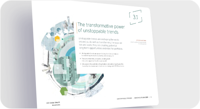 3.1 The transformative power of unstoppable trends Unstoppable trends are reshaping the world STEVEN WIETING around us. As well as transforming the ways we Chief Investment Strategist and Chief Economist live and work, they are creating potential long-term opportunities and risks for portfolios. ƒ Unstoppable trends are powerful long-term forces that are transforming the world economy and everyday life ƒ They are inherently disruptive, creating both risks and opportunities for your wealth ƒ We explore the potential of digitization, innovative healthcare, the transition to cleaner and more secure energy and US-China rivalry Citi Global Wealth UNSToPPABLe TreNDS | | 51 Investments