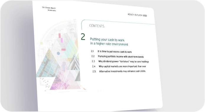 Citi Global Wealth Investments CONTENTS 2 Putting your cash to work in a higher rate environment 2.1 It is time to put excess cash to work 2.2 Pursuing portfolio income with short-term bonds 2.3 Why dividend grower “tortoises” may be core holdings 2.4 Why capital markets are more important than ever 2.5 Alternative investments may enhance cash yields