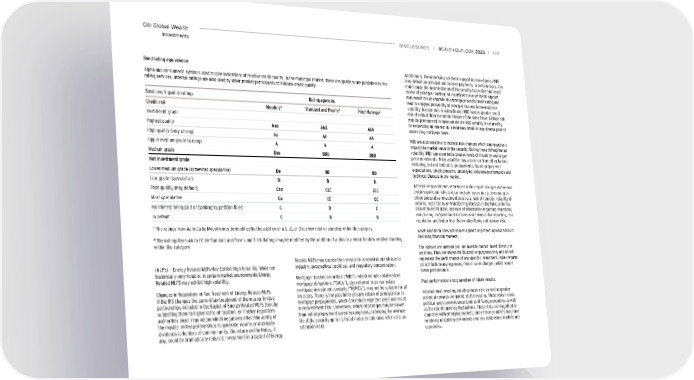 Citi Global Wealth DiSCLoSUreS | | 109 Investments Bond rating equivalence Additionally, the underlying collateral supporting non-Agency MBS may default on principal and interest payments. In certain cases, this Alpha and/or numeric symbols used to give indications of relative credit quality. In the municipal market, these designations are published by the could cause the income stream of the security to decline and result rating services. Internal ratings are also used by other market participants to indicate credit quality. in loss of principal. Further, an insufficient level of credit support may result in a downgrade of a mortgage bond’s credit rating and Bond credit quality ratings Rating agencies lead to a higher probability of principal loss and increased price volatility. Investments in subordinated MBS involve greater credit 1 2 2 Credit risk Moody's Standard and Poor's Fitch Ratings risk of default than the senior classes of the same issue. Default risk Investment grade may be pronounced in cases where the MBS security is secured by, or evidencing an interest in, a relatively small or less diverse pool of Highest quality Aaa AAA AAA underlying mortgage loans. High quality (very strong) Aa AA AA MBS are also sensitive to interest rate changes which can negatively Upper medium grade (strong) A A A impact the market value of the security. During times of heightened Medium grade Baa BBB BBB volatility, MBS can experience greater levels of illiquidity and larger price movements. Price volatility may also occur from other factors Not Investment grade including, but not limited to, prepayments, future prepayment Lower medium grade (somewhat speculative) Ba BB BB expectations, credit concerns, underlying collateral performance and technical changes in the market. Low grade (speculative) B B B Alternative investments referenced in this report are speculative and Poor quality (may default) Caa CCC CCC entail significant risks that can include losses due to leveraging or Most speculative Ca CC CC other speculative investment practices, lack of liquidity, volatility of returns, restrictions on transferring interests in the fund, potential No interest being paid or bankruptcy petition filled C D C lack of diversification, absence of information regarding valuations In default C D D and pricing, complex tax structures and delays in tax reporting, less regulation and higher fees than mutual funds and advisor risk. 1 The ratings from Aa to Ca by Moody's may be modified by the addition of a 1, 2, or 3 to show relative standing within the category. Asset allocation does not assure a profit or protect against a loss in 2 The ratings from AA to CC by Standard and Poor's and Fitch Ratings may be modified by the addition of a plus or a minus to show relative standing declining financial markets. within the category. The indexes are unmanaged. An investor cannot invest directly in an index. They are shown for illustrative purposes only and do not Related MLPs may expose the investor to concentration risk due to represent the performance of any specific investment. Index returns (MLP’s) - Energy Related MLPs May Exhibit High Volatility. While not industry, geographical, political, and regulatory concentration. do not include any expenses, fees or sales charges, which would historically very volatile, in certain market environments Energy lower performance. Related MLPS may exhibit high volatility. Mortgage-backed securities (“MBS”), which include collateralized mortgage obligations (“CMOs”), also referred to as real estate Past performance is no guarantee of future results. Changes in Regulatory or Tax Treatment of Energy Related MLPs. mortgage investment conduits (“REMICs”), may not be suitable for all If the IRS changes the current tax treatment of the master limited investors. There is the possibility of early return of principal due to International investing entails greater risk, as well as greater partnerships included in the Basket of Energy Related MLPs thereby mortgage prepayments, which can reduce expected yield and result potential rewards compared to US investing. These risks include subjecting them to higher rates of taxation, or if other regulatory in reinvestment risk. Conversely, return of principal may be slower political and economic uncertainties of foreign countries as well authorities enact regulations which negatively affect the ability of than initial prepayment speed assumptions, extending the average as the risk of currency fluctuations. These risks are magnified in the master limited partnerships to generate income or distribute life of the security up to its listed maturity date (also referred to as countries with emerging markets, since these countries may have dividends to holders of common units, the return on the Notes, if extension risk). relatively unstable governments and less established markets and any, could be dramatically reduced. Investment in a basket of Energy economics.