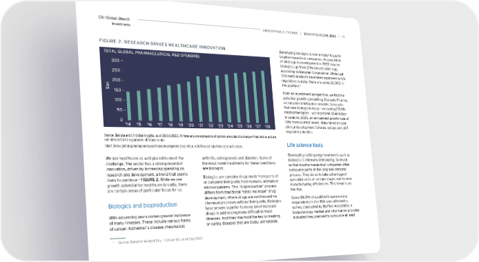 Citi Global Wealth UNSToPPABLe TreNDS | | 79 Investments FiGUre 2. reSeArCH DriveS HeALTHCAre iNNovATioN Developing biologics is now a major focus for biopharmaceutical companies. Around 60% TOTAL GLOBAL PHARMACEUTICAL R&D SPENDING of all drugs in development in 2022 may be 300 biologics, up from 20% two decades ago, according to Danaher Corporation. While just 250 500 such products have been approved by US regulators to date, there are some 20,000 in 200 the pipeline.2 n $b 150 From an investment perspective, we find the potential growth compelling. Evaluate Pharma, 100 an industry intelligence provider, forecasts that new biological drugs – excluding COVID- 50 related therapies – will represent $541 billion in sales by 2026, an annualized growth rate of 0 10% from current levels. Risks faced include '14 '15 '16 '17 '18 '19 '20 '21 '22 '23 '24 '25 '26 '27 '28 clinical development failures, delays and stiff regulatory hurdles. Source: Statista and Citi Global Insights, as of 28 Oct 2022. All forecasts are expressions of opinion, are subject to change without notice, and are not intended to be a guarantee of future events. Life science tools Chart shows global spending on research and development since 2014, with forecast data from 2022 until 2028. We see healthcare as well placed to meet the arthritis, osteoporosis and diabetes. Some of Developing cutting-edge treatments such as challenge. The sector has a strong record of the most novel treatments for these conditions biologics is intensely demanding. So much innovation, driven by increasing spending on are biologics. so that biopharmaceutical companies often research and development, a trend that seems outsource parts of the long and intricate likely to continue – FIGURE 2. While we see Biologics are complex drugs made from parts of process. They do so to take advantage of growth potential for healthcare broadly, there or complete living cells from humans, animals or specialist skills at certain stages and to seek are certain areas of particular focus for us. microorganisms. This “bioproduction” process manufacturing efficiencies. This trend is on differs from traditional “small molecule” drug the rise. development, where drugs are synthesized via Some 86.9% of qualified bioprocessing Biologics and bioproduction chemical processes without living cells. Biologics respondents in the 19th annual industry have proven superior to many small molecule survey conducted by BioPlan Associates, a With advancing years comes greater incidence drugs in addressing many difficult-to-treat biotechnology market and information provider, of many illnesses. These include various forms illnesses. And they may hold the key to treating indicated they planned to outsource at least of cancer, Alzheimer’s disease, rheumatoid or curing diseases that are today untreatable. 2 Source: Danaher Analyst Day – Cytiva HQs, as of Sep 2022