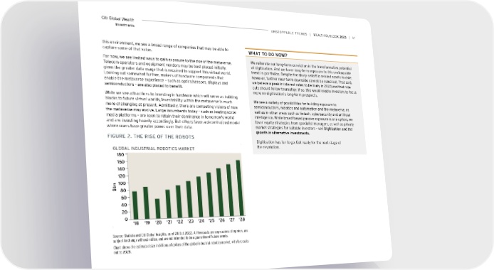 Citi Global Wealth UNSToPPABLe TreNDS | | 67 Investments this environment, we see a broad range of companies that may be able to wHAT To Do Now? capture some of that value. For now, we see limited ways to gain exposure to the rise of the metaverse. We reiterate our long-term conviction in the transformative potential Telecom operators and equipment vendors may be best placed initially, of digitization. And we favor long-term exposure to this unstoppable given the greater data usage that is required to support this virtual world. trend in portfolios. Despite the sharp selloff in related assets to date, Looking out somewhat further, makers of hardware components that however, further near-term downside cannot be ruled out. That said, enable the metaverse experience – such as optics/sensors, displays and we believe a peak in interest rates to be likely in 2023 and that rate semiconductors – are also placed to benefit. cuts should follow thereafter. If so, this would enable investors to focus more on digitization’s long-term prospects. While we see attractions to investing in hardware which will serve as building blocks to future virtual worlds, investability within the metaverse is much We see a variety of possibilities for building exposure to more challenging at present. Admittedly, there are competing visions of how semiconductors, robotics and automation and the metaverse, as the metaverse may evolve. Large incumbents today – such as leading social well as in other areas such as fintech, cybersecurity and artificial media platforms – are keen to retain their dominance in tomorrow’s world intelligence. While broad-based passive exposure is one option, we and are investing heavily accordingly. But others favor a decentralized model favor equity strategies from specialist managers, as well as private where users have greater power over their data. market strategies for suitable investors – see Digitization and the growth in alternative investments. FiGUre 2. THe riSe oF THe roBoTS Digitization has far to go. Get ready for the next stage of GLOBAL INDUSTRIAL ROBOTICS MARKET the revolution. 180 160 140 120 n 100 $b80 60 40 20 0 '18 '19 '20 '21 '22 '23 '24 '25 '26 '27 '28 Source: Statista and Citi Global Insights, as of 28 Oct 2022. All forecasts are expressions of opinion, are subject to change without notice, and are not intended to be a guarantee of future events. Chart shows the estimated size in billions of dollars of the global industrial robotics market, with forecasts out to 2028.