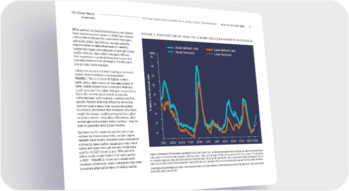 Citi Global Wealth PUTTiNG YoUr CASH To worK iN A HiGHer rATe eNviroNMeNT | | 46 Investments While painful for traditional investors, we believe FiGUre 1. ProPorTioN oF HiGH-YieLD BoND AND LoAN MArKeTS iN DiSTreSS fixed income market turmoil in 2022 has created a favorable landscape for alternative managers going into 2023. Specifically, we see potential Bond default rate Loan default rate opportunities to take advantage of volatility, Bond forecast Loan forecast capital shortages and episodes of outright stress 18% and/or distress. Specialist managers will use 16 their expertise in underwriting new issues and pursuing event-driven strategies in both public and private credit markets. 14 Lately, the universe of debt trading at stressed and/or distressed levels has expanded – te12 FIGURE 1. This is a result of tighter central t ra l bank policy, restrictions on the deployment of u 10 bank capital, higher bond yields and widening fa credit spreads – the latter owing to recessionary de o 8 fears. We see this bond selloff as broadly m indiscriminate, with investors overlooking firm- 2 1 specific factors that may influence when and g n i 6 l how borrowers repay their outstanding debt. i a As a result, we believe that managers who have r T insight into issuer quality and potential capital 4 structure events – including refinancings, debt exchanges and outright restructurings – may be 2 able to generate strong total returns. Spooked by this shakeout and the uncertain 0 outlook for corporate profits, certain capital markets have largely closed to some companies wishing to raise capital. Issuance of high-yield 1/01 3/03 5/05 7/07 9/09 11/11 1/14 3/16 5/18 7/20 8/21 9/22 bonds and loans through the end of the third quarter of 2022 stood at just 78% and 61% below levels respectively in the same period Source: Citi Research, Citi Leveraged Loan Tracker, FTSE, as of 30 Sep 2022. All forecasts are expressions of opinion, are subject to change without in 2021 – FIGURE 2. Given such severe debt- notice and are not intended to be a guarantee of future events. Indices are unmanaged. An investor cannot invest directly in an index. They are shown issuance constraints, many companies may need for illustrative purposes only and do not represent the performance of any specific investment. Index returns do not include any expenses, fees or to explore alternative ways of raising capital. sales charges, which would lower performance. Past performance is no guarantee of future results. Real results may vary. See Glossary for definitions. Chart shows the percentage of US high-yield loans and bonds in distress. Distress is defined here as a bond trading below $60 and a loan trading below $80, where par is $100.