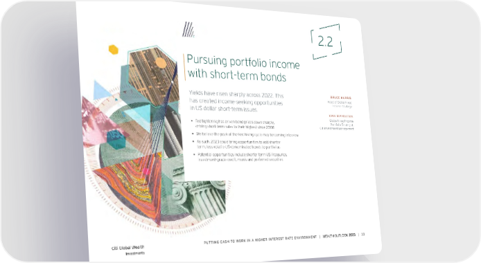 2.2 Pursuing portfolio income with short-term bonds Yields have risen sharply across 2022. This BRUCE HARRIS has created income-seeking opportunities Head of Global Fixed Income Strategy in US dollar short-term issues. KRIS XIPPOLITOS Global Fixed Income ƒ Fed tightening has driven bond prices down sharply, Portfolio Strategist, driving short-term rates to their highest since 2008 Citi Investment Management ƒ We believe the peak of the Fed hiking cycle may be coming into view ƒ As such, 2023 could bring opportunities to add shorter term, less volatile US-denominated bonds to portfolios ƒ Potential opportunities include shorter term US Treasuries, investment-grade credit, munis and preferred securities Citi Global Wealth PUTTiNG CASH To worK iN A HiGHer iNTereST rATe eNviroNMeNT | | 33 Investments