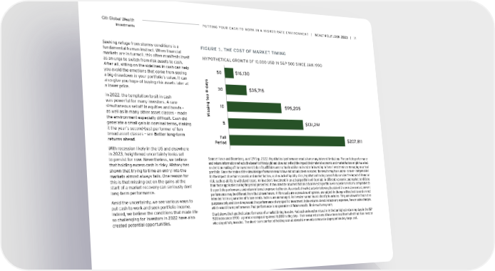 Citi Global Wealth PUTTiNG YoUr CASH To worK iN A HiGHer rATe eNviroNMeNT | | 31 Investments Seeking refuge from stormy conditions is a FiGUre 1. THe CoST oF MArKeT TiMiNG fundamental human instinct. When financial markets are in turmoil, this often manifests itself HYPOTHETICAL GROWTH OF 10,000 USD IN S&P 500 SINCE JAN 1990 as an urge to switch from risk assets to cash. After all, sitting on the sidelines in cash can help 50 $16,130 you avoid the emotions that come from seeing a big drawdown in your portfolio’s value. It can also give you hope of buying risk assets later at a lower price. 30 $35,715 In 2022, the temptation to sit in cash was powerful for many investors. A rare 10 $95,205 simultaneous selloff in equities and bonds – as well as in many other asset classes – made Missing top # days the environment especially difficult. Cash did $131,251 generate a small gain in nominal terms, making 5 it the year’s second-best performer of ten broad asset classes – see Better long-term Full returns ahead. Period $207,811 With recession likely in the US and elsewhere in 2023, heightened uncertainty looks set to persist for now. Nevertheless, we believe Source: Haver and Bloomberg, as of 29 Sep, 2022. Hypothetical performance results have many inherent limitations. The portfolio performance that holding excess cash is risky. History has and return information reflects the benefit of hindsight and does not reflect the impact that material economic and market factors might have had shown that trying to time an entry into the on decision making of the Investment Lab or its affiliates were actually advise an investor in investing in these investments or managing an actual portfolio. Since the trades of the simulated performance results have not actually been executed, the results may have under- or over-compensated markets almost always fails. One reason for for the impact of certain economic and market factors, such as lack of liquidity. Also, hypothetical trading cannot fully consider the impact of financial this is that missing out on the gains at the risk, such as ability to withstand losses. An investor‘s investment in an actual portfolio will be made in different economic and market conditions start of a market recovery can seriously dent than those applicable during the period presented. It should not be assumed that an actual investor portfolio will experience returns comparable to long-term performance. the portfolio performance and return information presented herein. As a result of market activity following the date of the period presented, current performance may be different from that shown herein. All forecasts are expressions of opinion, are subject to change without notice and are not Amid the uncertainty, we see various ways to intended to be a guarantee of future events. Indices are unmanaged. An investor cannot invest directly in an index. They are shown for illustrative put cash to work and seek portfolio income. purposes only and do not represent the performance of any specific investment. Index returns do not include any expenses, fees or sales charges, which would lower performance. Past performance is no guarantee of future results. Real results may vary. Indeed, we believe the conditions that made life Chart shows the hypothetical performance of a market timing investor. Had such an investor missed only the ten highest returning days in the S&P so challenging for investors in 2022 have also 500 Index since 1990 – a period encompassing almost 8,000 trading days – their overall return would have been less than half of that of an investor created potential opportunities. who stayed fully invested. The short-term comfort of holding cash at stressful moments comes at a disproportionately large cost.