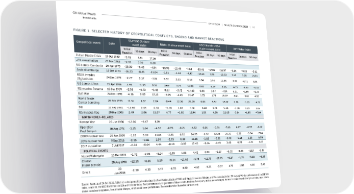 Citi Global Wealth overview | | 20 Investments FiGUre 1. SeLeCTeD HiSTorY oF GeoPoLiTiCAL CoNFLiCTS, SHoCKS AND MArKeT reACTioNS S&P 500 (% since Nikkei (% since event date) MSCi world ex USA DXY Dollar index Geopolitical event Date event date) (% since event date) initial 30 days 90 days initial 30 days 90 days initial 30 days 90 days initial 30 days 90 days reaction reaction reaction reaction Cuban Missile Crisis 19 oct 1962 -3.78 7.61 17.16 JFK assasination 21 Nov 1963 -2.81 3.06 8.28 US bombs Cambodia 29 Apr 1970 -15.30 -6.43 -4.94 -15.93 -12.49 -7.64 -10.45 -17.01 -16.07 -0.20 -0.23 -0.51 Arab oil embargo 18 oct 1973 -16.23 -8.45 -13.04 -1.81 -1.44 -4.47 -14.68 1.96 -18.53 7.48 5.28 14.04 USSR invades 24 Dec 1979 -2.27 5.37 -7.78 0.57 2.63 0.68 3.94 3.94 11.85 -1.06 -0.71 5.91 Afghanistan US bombs Libya 15 Apr 1986 2.95 -1.39 0.16 3.09 3.73 16.08 0.00 6.19 8.16 -4.15 -4.80 -5.30 US invades Panama 15 Dec 1989 -2.06 -3.73 -3.43 0.63 -3.71 -14.63 0.00 3.67 -7.04 0.31 -1.69 -0.44 Gulf War 24 Dec 1990 -4.16 0.09 12.10 -6.95 -4.43 10.47 1.75 1.75 15.97 -0.21 -3.61 4.90 World Trade 26 Feb 1993 -0.31 1.67 2.04 -0.44 12.36 23.00 0.00 8.52 18.62 0.18 -1.15 -4.79 Center bombing 911 11 Sep 2001 -11.60 0.45 4.34 -6.28 1.48 3.68 -8.48 3.24 5.48 -1.08 0.29 1.85 US invades Iraq 20 Mar 2003 2.49 2.06 15.57 4.77 -1.02 12.94 1.53 4.58 22.05 0.84 -1.85 -7.89 NorTH KoreA-reLATeD Korean War 23 Jun 1950 -12.80 -8.67 1.20 Operation 18 Aug 1976 -3.15 1.64 -4.32 -0.75 -0.21 -4.52 0.00 -0.26 -7.60 0.07 -0.57 -0.12 Paul Bunyan 2009 nuclear test 25 Apr 2009 -1.28 5.09 13.05 -2.46 6.92 14.20 -2.32 12.28 21.21 0.52 -5.54 -7.04 2016 nuclear test 9 Sep 2016 -2.55 -0.81 2.97 -2.03 0.39 10.65 -2.06 -0.81 -0.72 -0.01 1.36 6.05 2017 escalation 7 Jul 2017 -0.24 -0.64 4.44 -0.30 -3.89 12.43 -0.26 -0.49 3.60 0.23 -1.22 1.62 PoLiTiCAL eveNTS Nixon/Watergate 15 Mar 1974 -1.72 -7.28 -8.04 -1.80 1.05 4.42 0.00 -2.57 -6.12 -1.04 -1.57 -2.12 Clinton 20 Aug 1998 -12.30 -6.20 5.59 -8.34 -11.66 -6.74 -12.75 -12.75 -6.37 -1.76 -5.18 -6.58 intern scandal Brexit 23 -2.30 4.30 3.72 -6.93 3.50 4.62 -5.31 -0.37 1.70 1.85 4.00 2.46 Jun 2016 Source: Haver, as of 14 Oct 2022. Table lists select geopolitical events since the Pearl Harbor attacks of 1941 until Russia’s invasion of Ukraine, and the associated initial, 30-day and 90-day performances of the S&P 500 Index, crude oil, the MSCI World Index ex USA and US dollar Index. Past performance is no guarantee of future results. Real results may vary. Indices are unmanaged. An investor cannot invest directly in an index. Index returns do not include any expenses, fees or sales charges, which would lower performance. They are shown for illustrative purposes only.