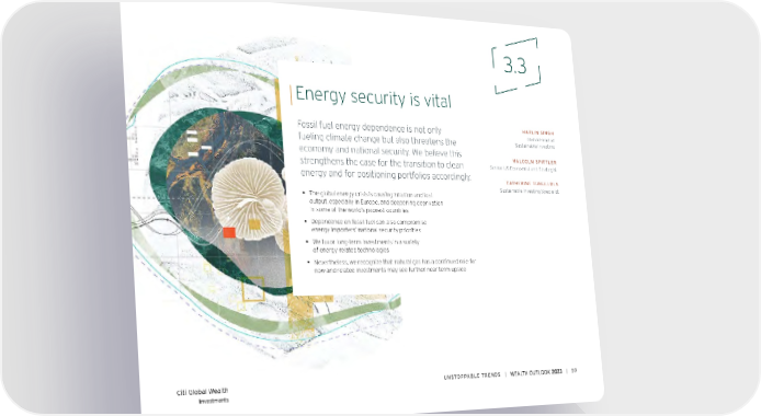3.3 Energy security is vital Fossil fuel energy dependence is not only HARLIN SINGH Global Head of fueling climate change but also threatens the Sustainable Investing economy and national security. We believe this MALCOLM SPITTLER strengthens the case for the transition to clean Senior US Economist and Strategist energy and for positioning portfolios accordingly. CATHERINE TURULLOLS Sustainable Investing Specialist ƒ The global energy crisis is causing inflation and lost output, especially in Europe, and deepening deprivation in some of the world’s poorest countries ƒ Dependence on fossil fuel can also compromise energy importers’ national security priorities ƒ We favor long-term investments in a variety of energy-related technologies ƒ Nevertheless, we recognize that natural gas has a continued role for now and related investments may see further near-term upside Citi Global Wealth UNSToPPABLe TreNDS | | 59 Investments