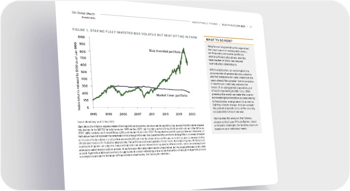 Citi Global Wealth UNSToPPABLe TreNDS | | 53 Investments FiGUre 1. STAYiNG FULLY iNveSTeD wAS voLATiLe BUT BeAT SiTTiNG iN CASH wHAT To Do Now? 1000 Despite our longstanding message about the importance of unstoppable trends, 9 900 9 Stay invested portfolio we frequently encounter portfolios 9 1 with insufficient allocations. And the n 800 a bear market of 2022 has reduced f J700 overvaluation dramatically. o s a 600 Within digitization, we contemplate the 0 0 growing role of semiconductors, robotics 1 $ 500 and the metaverse for data creators in the o t years ahead. We consider how innovations d 400 e in healthcare could help address the s a needs of an aging global population and b 300 e r of Asia’s expanding middle class. With s greening the world, we make the case for n 200 r Market timer portfolio u accelerating the transition to clean energy t e to help bolster energy security as well as r 100 x fighting climate change. And we consider e d 0 the potential beneficiaries of the recently n I 1995 1999 2003 2007 2011 2015 2019 2023 escalated US-China trade war. Having read the analysis that follows, Source: Bloomberg, as of 22 Nov 2022. please contact your Private Banker about Chart shows the inflation-adjusted return of two hypothetical allocations, one a buy and hold portfolio (Stay Invested Portfolio) which remained actionable strategies for building exposure fully invested in the S&P 500 Index between Jan 1995 and Nov 2022, and the other portfolio (Timing Portfolio) which sold out of the S&P in Jan based on your individual needs. 2000, shifted entirely into 3-month Treasury Bills and remained there to Nov 2022. The hypothetical portfolios past performance information set forth above does not represent the performance of an actual portfolio and is no guarantee of future returns of any portfolio. As a result of market activity since the date above, current performance may be different from that shown. Indices on this page are widely recognized, unmanaged indices of major asset classes. For illustrative purposes only. Past performance does not guarantee future results. Real results may vary. All forecasts are expressions of opinion, are subject to change without notice and are not intended to be a guarantee of future events. Indices are unmanaged and an investor cannot invest directly in an index. All performance information shown above is hypothetical, not the actual performance of any client account. Hypothetical information reflects the application of a model methodology and selection of securities in hindsight. No hypothetical record can completely account for the impact of financial risk in actual trading. See Glossary for definitions.