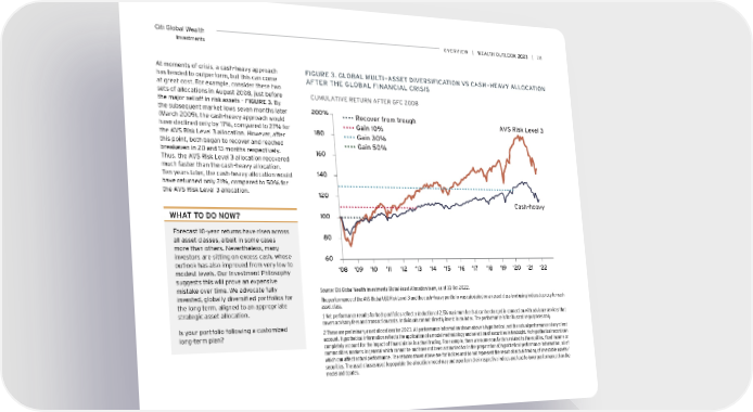 Citi Global Wealth overview | | 28 Investments At moments of crisis, a cash-heavy approach FiGUre 3. GLoBAL MULTi-ASSeT DiverSiFiCATioN vS CASH-HeAvY ALLoCATioN has tended to outperform, but this can come AFTer THe GLoBAL FiNANCiAL CriSiS at great cost. For example, consider these two sets of allocations in August 2008, just before CUMULATIVE RETURN AFTER GFC 2008 the major selloff in risk assets – FIGURE 3. By the subsequent market lows seven months later 200% Recover from trough (March 2009), the cash-heavy approach would AVS Risk Level 3 have declined only by 17%, compared to 27% for Gain 10% the AVS Risk Level 3 allocation. However, after 180 Gain 30% this point, both began to recover and reached Gain 50% breakeven in 20 and 13 months respectively. 160 Thus, the AVS Risk Level 3 allocation recovered much faster than the cash-heavy allocation. Ten years later, the cash-heavy allocation would 140 have returned only 21%, compared to 50% for the AVS Risk Level 3 allocation. 120 Cash-heavy wHAT To Do Now? 100 Forecast 10-year returns have risen across 80 all asset classes, albeit in some cases more than others. Nevertheless, many investors are sitting on excess cash, whose 60 outlook has also improved from very low to modest levels. Our Investment Philosophy ‘08 ‘09 ‘10 ‘11 ‘12 ‘13 ‘14 ‘15 ‘16 ‘17 ‘18 ‘19 ‘20 ‘21 ‘22 suggests this will prove an expensive mistake over time. We advocate fully Source: Citi Global Wealth Investments Global Asset Allocation team, as of 31 Oct 2022. invested, globally diversified portfolios for The performance of the AVS Global USD Risk Level 3 and the cash-heavy portfolio was calculated on an asset class level using indices to proxy for each the long term, aligned to an appropriate asset class. strategic asset allocation. 1 Net performance results for both portfolios reflect a deduction of 2.5% maximum fee that can be charged in connection with advisory services that Is your portfolio following a customized covers advisory fees and transaction costs. Individuals cannot directly invest in an index. The performance is for illustrative purposes only. long-term plan? 2 These are preliminary asset allocations for 2023. All performance information shown above is hypothetical, not the actual performance of any client account. Hypothetical information reflects the application of a model methodology and selection of securities in hindsight. No hypothetical record can completely account for the impact of financial risk in actual trading. For example, there are numerous factors related to the equities, fixed income or commodities markets in general which cannot be and have not been accounted for in the preparation of hypothetical performance information, all of which can affect actual performance. The returns shown above are for indices and do not represent the result of actual trading of investable assets/ securities. The asset classes used to populate the allocation model may underperform their respective indices and lead to lower performance than the model anticipates.