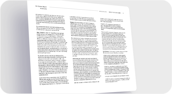 Citi Global Wealth DiSCLoSUreS | | 112 Investments and consider if it’s suitable for your objectives, financial situation or subsidiaries (collectively “Connected Persons”) and that of Citibank N.A. UAE is licensed by UAE Securities and Commodities or needs before making any investment decision. Investors are an investor itself, as a result of the various investment and/or Authority (“SCA”) to undertake the financial activity as Promoter advised to obtain independent legal, financial and taxation advice commercial businesses and/or activities of the Connected Persons. under license number 602003. prior to investing. Investments are not deposits, are not protected by the Deposit Protection Scheme in Hong Kong and are subject to Singapore: This communication is distributed in Singapore by Citibank N.A. UAE is registered with Central Bank of UAE investment risk including the possible loss of the principal amount Citibank Singapore Limited (“CSL”) to selected Citigold/Citigold under license numbers BSD/504/83 for Al Wasl Branch invested. Private Clients. CSL provides no independent research or analysis Dubai, 13/184/2019 for Mall of the Emirates Branch Dubai, of the substance or in preparation of this communication. Please BSD/2819/9 for Sharjah Branch, and BSD/692/83 for Abu Dhabi This communication does not constitute the distribution of any contact your Citigold/Citigold Private Client Relationship Manager Branch. information in any jurisdiction in which it is unlawful to distribute in CSL if you have any queries on or any matters arising from or in such information to any person in such jurisdiction. connection with this communication. Investment products are not This is not an official statement of Citigroup Inc. and may not reflect insured under the provisions of the Deposit Insurance and Policy all of your investments with or made through Citibank. For an India: Citibank N.A. India (“Citi”) does NOT provide investment Owners’ Protection Schemes Act of Singapore and are not eligible for accurate record of your accounts and transactions, please consult advisory services in any manner or form. Investment Products deposit insurance coverage under the Deposit Insurance Scheme. your official statement. Before making any investment, each investor distributed by Citi (i) are not bank deposits or obligations of must obtain the investment offering materials, which include a or guaranteed by Citibank, N.A. or Citigroup, Inc or any of its This communication is for general information only and should not description of the risks, fees and expenses and the performance affiliates or subsidiaries; and (ii) are subject to investment risks, be relied upon as financial advice. The information herein has no history, if any, which may be considered in connection with making including the possible loss of the principal amount invested. Past regard to the specific objectives, financial situation and particular an investment decision. Each investor should carefully consider performance is not indicative of future results, The ownership of any needs of any specific person and is not intended to be an exhaustive the risks associated with the investment and make a determination investment decision(s) shall exclusively vest with the Investor after discussion of the strategies or concepts mentioned herein or tax based upon the investor’s own particular circumstances, that the analysing all possible risk factors and by exercise of his/her/its or legal advice. Any person interested in the strategies or concepts investment is consistent with the investor’s investment objectives. At independent discretion and Citi shall not be liable or held liable for mentioned herein should consult their independent tax, legal, any time, Citigroup companies may compensate affiliates and their any consequences thereof. Investment products are not available to financial or other advisors, as appropriate. This communication does representatives for providing products and services to clients. US and Canada persons and may not be available in all jurisdictions. not constitute the distribution of any information or the making of Investment products are distributed by Citi on a non-discretionary any offer or solicitation by anyone in any jurisdiction in which such United Kingdom: This document is distributed in the U.K. by Citibank and non-participation basis. distribution or offer is not authorized or to any person to whom UK Limited and in Jersey by Citibank N.A., Jersey Branch. it is unlawful to distribute such information or make any offer or Citibank UK Limited is authorised by the Prudential Regulation This document does not constitute the distribution of any solicitation. information or the making of any offer or solicitation by anyone Authority and regulated by the Financial Conduct Authority and in any jurisdiction in which such distribution or offer is not Before making any investment, each investor must obtain the the Prudential Regulation Authority. Our firm’s Financial Services authorized or to any person to whom it is unlawful to distribute investment offering materials, which include a description of the Register number is 805574. Citibank UK Limited is a company such a document or make such an offer or solicitation. Please risks, fees and expenses and the performance history, if any, limited by shares registered in England and Wales with registered exercise diligence by reading & understanding the Key Information which may be considered in connection with making an investment address at Citigroup Centre, Canada Square, Canary Wharf, London Memorandum(s)/Scheme Investment Document(s) & Statement of decision. Interested investors should seek the advice of their E14 5LB, Companies House Registration No. 11283101. Additional Information/Term Sheet/Prospectus/ Offer Documents financial adviser about the issues discussed herein as appropriate. Citibank N.A., Jersey Branch is regulated by the Jersey Fina