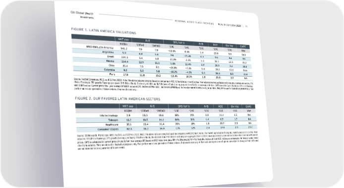 Citi Global Wealth reGioNAL ASSeT CLASS PreviewS | | 95 Investments FiGUre 1. LATiN AMeriCA vALUATioNS MKT cap P/e ePS YoY % P/B roe Div Yld CAPe US$bn ‘23Fwd ‘24FwD ‘23e ‘24e ‘23e ‘23e ‘23e 10yr MSCi eM Latin America 541.2 7.9 7.9 -13.0% 0.3% 1.4 23.8 9.9 16.0 Argentina 5.9 4.4 5.8 NA -25.4% 0.3 9.6 NA NA Brazil 324.3 6.6 6.8 -15.0% -2.2% 1.3 30.1 12.8 15.2 Mexico 154.4 12.9 11.5 5.8% 12.4% 1.9 18.0 3.2 18.8 Chile 35.4 7.5 8.1 -26.8% -7.3% 1.4 18.2 15.1 14.6 Colombia 9.2 5.5 5.8 -18.2% -4.5% 0.4 36.6 8.8 11.6 Peru 17.8 11.8 10.2 -13.4% 16.0% 1.8 20.8 3.9 NA Source: FactSet Consensus, MSCI, as of 22 Nov 2022. Note: The above data are compiled based on companies in MSCI AC World Index. Free MC is free-float adjusted market capitalization for regions, markets and sectors. P/E (Price/Earnings), EPS growth (Earnings per share), P/B (Price/Book), Dividend yield (DY) and RoE (Return on Equity) are aggregated from FactSet consensus estimates. CAPE stands for Cyclically Adjusted Price to Earnings, and is defined as: Current price/ten-year average inflation-adjusted EPS. Indices all from MSCI. Indices are unmanaged. An investor cannot invest directly in an index. They are shown for illustrative purposes only. Past performance is no guarantee of future returns. Real results may vary. FiGUre 2. oUr FAvoreD LATiN AMeriCAN SeCTorS MKT cap P/e ePS YoY % P/B roe Div Yld CAPe US$bn ‘23Fwd ‘24FwD ‘23e ‘24e ‘23e ‘23e ‘23e 10yr info technology 2.9 23.3 18.6 38% 25% 3.8 11.4 1.3 NA Telecom 10.2 18.5 14.1 84% 31% 1.4 0.7 1.7 NA Healthcare 39.1 13.4 11.4 20% 18% 1.8 20.7 2.8 NA Consumer staples 82.6 16.2 14.4 13% 12% 2.4 17.8 2.9 23.2 Source: Citi Research, Worldscope, MSCI, FactSet, as of 22 Nov 2022. Note: The above data are compiled based on companies in MSCI AC World Index. The market capitalization for regions, markets and sectors are free-float adjusted. P/E (Price/Earnings), EPS growth (Earnings per share), P/B (Price/Book), Dividend yield and RoE (Return on Equity) are aggregated from FactSet consensus estimates (calendarized to December year end) with current prices. CAPE is calculated by current price divided by ten-year average EPS based on MSCI index level data. NM = Not Meaningful; NA = Not Available. Indices all from MSCI. Indices are unmanaged. An investor cannot invest directly in an index. They are shown for illustrative purposes only. Past performance is no guarantee of future returns. Real results may vary. All forecasts are expressions of opinion, are subject to change without notice and are not intended to be a guarantee of future events.