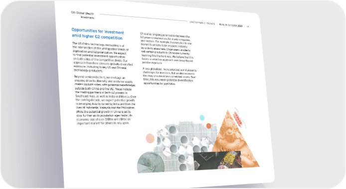 Citi Global Wealth UNSToPPABLe TreNDS | | 58 Investments Opportunities for investment Of course, ongoing polarization between the amid higher G2 competition G2 powers creates risks for many companies and sectors. For example, business lost in one market is unlikely to be replaced instantly The US-China technology decoupling is at by activity elsewhere. Chipmakers unable to the intersection of the unstoppable trends of sell certain products to China are currently digitization and G2 polarization. We expect learning this the hard way. We believe that this to find potential investment opportunities favors a selective approach over broad-based on both sides of the competitive divide. Our passive exposure. approach therefore stresses globally diversified exposure, including to key US and Chinese A less globalized, more polarized world presents technology producers. challenges for investors. But weaker economic ties may also mean less correlated assets. Over Beyond semiconductors, we envisage an time, this may mean potential diversification ongoing drive to diversify and reinforce supply opportunities for portfolios. chains on both sides, with potential beneficiaries outside both China and the US. These include the trading partners of both G2 powers in Southeast Asia, as well as India and Mexico. Over the coming decade, we expect potential growth in emerging Asia to be led by India and then the likes of Indonesia, Malaysia and the Philippines. While the potential growth in China is set to slow further as its population ages faster, its economic size of over $18trn will still be an important market for others to rely upon.