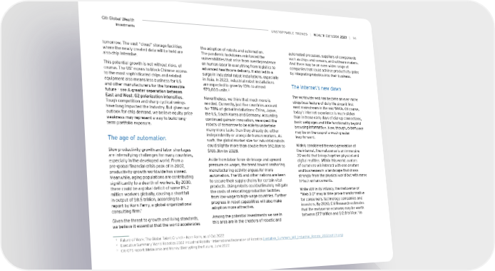 Citi Global Wealth UNSToPPABLe TreNDS | | 66 Investments tomorrow. The vast “cloud” storage facilities the adoption of robots and automation. automated processes, suppliers of components where the newly created data will be held are The pandemic lockdowns reinforced the such as chips and sensors, and software makers. also chip intensive. vulnerabilities that arise from overdependence And there may be an even wider range of on human labor in everything from logistics to companies that could achieve productivity gains This potential growth is not without risks, of advanced healthcare delivery. It also led to a by integrating robotics into their business. course. The US’ moves to block Chinese access surge in industrial robot installations, especially to the most sophisticated chips and related in Asia. In 2023, industrial robot installations equipment also means less business for US are expected to grow by 10% to almost The internet’s new dawn and other manufacturers for the foreseeable 570,000 units.2 future – see A greater separation between The worldwide web has become an ever-more East and West: G2 polarization intensifies. Nevertheless, we think that much more is ubiquitous feature of daily life since it first Tough competition and sharp cyclical swings needed. Currently, just five countries account went mainstream in the mid-1990s. Of course, have long impacted the industry. But given our for 78% of global installations: China, Japan, today’s internet experience is much slicker outlook for chip demand, we believe equity price the US, South Korea and Germany. Assuming than in those early days of dial-up connections, weakness may represent a way to build long- continued gains in innovation, we expect the basic webpages and little functionality beyond term portfolio exposure. robots of tomorrow to be able to undertake browsing information. Now, though, cyberspace many more tasks than they already do, either may be on the cusp of a much greater The age of automation independently or alongside human workers. As leap forward. such, the global market size for industrial robots could slightly more than double from $92.8bn to Widely considered the next generation of Slow productivity growth and labor shortages $165.3bn by 2028. the internet, the metaverse is an immersive are intensifying challenges for many countries, 3D world that brings together physical and especially in the developed world. From a Aside from labor force shrinkage and upward digital realities. Within this world, avatars pre-global financial crisis peak of in 2007, pressure on wages, the trend toward onshoring of ourselves will interact with one another productivity growth worldwide has slowed. manufacturing activity argues for more and businesses in a landscape that draws Meanwhile, aging populations are contributing automation. The US and other nations are keen strongly from the physical world but with many significantly to a dearth of workers. By 2030, to secure their supply chains for certain vital hi-tech enhancements. there could be a global deficit of some 85.2 products. Using robots could ultimately mitigate million workers globally, causing a shortfall the costs of relocating production facilities While still in its infancy, the metaverse or in output of $8.5 trillion, according to a from low-wage to high-wage countries. Further “Web 3.0” may in time prove transformative report by Korn Ferry, a global organizational progress in robot capabilities will also make for consumers, technology companies and 1 adoption more attractive. investors. By 2030, Citi Research estimates consulting firm. that the metaverse economy may be worth Given the threat to growth and living standards, Among the potential investments we see in between $7.7 trillion and $12.8 trillion.3 In we believe it essential that the world accelerates this area are in the creators of robotic and 1 Future of Work: The Global Talent Crunch – Korn Ferry, as of Oct 2022 2 Executive Summary World Robotics 2022 Industrial Robots – International Federation of Robotics Executive_Summary_WR_Industrial_Robots_2022.pdf (ifr.org) 3 Citi GPS report: Metaverse and Money: Decrypting the Future, June 2022