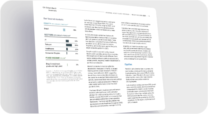 Citi Global Wealth reGioNAL ASSeT CLASS PreviewS | | 94 Investments Our favored markets Latin America’s largest economies could grow down inflation expectations, its success could be on average around 1% in 2023. This rate is at risk if Lula’s spending plans are undiluted. 1 lower than the 2.5-3.0% range for 2022. And EQUITY EPS GROWTH FORECAST it reflects our view that the global economy Colombia, Peru and Chile have unproven new will decelerate in 2023 as higher policy rates administrations, which face the challenge of Brazil -15% take effect. reconciling aggressive social spending promises with available resources. Chile and Colombia are In 2022, the region added two further left- the most uncertain here, as they are dealing with 1 SECTORS EPS GROWTH FORECAST leaning presidents: Gustavo Petro in Colombia proposals for more significant changes such as and Luis Ignacio Lula da Silva in Brazil. These constitutional reform and contentious pension, IT 38% two elections completed the wave of left-wing tax, labor and property rights reforms. populism across all the major economies. Telecom 84% Argentina, which often goes against the grain, Argentina will likely have another rough might break this pattern in 2023. year, with government spending and inflation Healthcare 20% accelerating as elections loom. Investors will Despite a shift in economic policy toward watch for a potential change in administration Consumer Staples 13% higher public spending among these countries, that could foster positive expectations. But the the magnitude of risks is quite different. Each macroeconomic adjustment required is massive FIXED INCOME YIELDS2 nation exhibits different political and economic and a challenge for any government. undercurrents, requiring investor discernment in Brazil investment portfolio construction. Equities grade and high yield 6% Mexico’s economy is likely to suffer the deceleration we expect in the US, its largest The MSCI Latin America Index is up nearly 4% Sources: 1 - FactSet consensus estimates, as of 23 Nov trading partner. López Obrador’s (“AMLO”) year to date, a strong performance compared 2022; 2 - Bloomberg, as of 23 Nov 2022. Past perfor- six-year term will end in 2024, suggesting to global equities, down around 18%. Excluding mance is no guarantee of future returns. Real results may vary. Indices are unmanaged. An investor cannot he will focus more on building his legacy as Colombia – down 15% albeit still outperforming invest directly in an index. All forecasts are expres- he cannot be re-elected. Reduced economic global equities – every other major regional sions of opinion, are subject to change without notice activity constrained fiscal resources and political and are not intended to be a guarantee of future equity market saw positive returns to events. uncertainty could put pressure on Mexico’s varying degrees. solid market performance since the 2020 pandemic lows. Latin American earnings per share (EPS) growth was a solid 13% in 2022. And the absolute level The fate of Brazil’s fiscal accounts will remain of expected EPS of $287 is not far from the markets’ principal focus. Lula’s campaign commodity super cycle record of 2007-2011. pledges for social spending add up to roughly Forward price/earnings multiples going into $40bn, around 2% of GDP, such resources that 2023 are practically the same as last year, are unavailable within the current spending again suggesting the potential for attractive framework. The fiscal spending debate may valuations. For the region, a 12.5% decline in dominate economic headlines throughout 2023. EPS is forecast. While the central bank has managed to bring