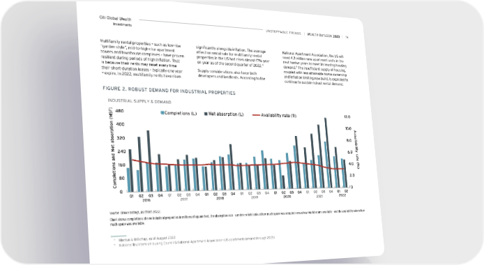 Citi Global Wealth UNSToPPABLe TreNDS | | 74 Investments Multifamily rental properties – such as low-rise significantly alongside inflation. The average National Apartment Association, the US will “garden style”, mid-to-high-rise apartment effective rental rate for multifamily rental need 4.3 million new apartment units in the towers and townhouse complexes – have proven properties in the US had risen almost 17% year next twelve years to meet increasing housing resilient during periods of high inflation. That on year as of the second quarter of 2022.4 demand.5 The insufficient supply of housing, is because their rents may reset every time coupled with less attainable home ownership their short-duration leases – typically one year Supply considerations also favor both and inflation limiting new build, is expected to – expire. In 2022, multifamily rents have risen developers and landlords. According to the continue to sustain robust rental demand. FiGUre 2. roBUST DeMAND For iNDUSTriAL ProPerTieS INDUSTRIAL SUPPLY & DEMAND 480 Completions (L) Net absorption (L) Availability rate (R) 12.0 400 10.0 Avaailability rate (%) 320 8.0 240 6.0 160 4.0 80 2.0 Completions and Net absorption (MSF) 0 0 Q1 Q2 Q3 Q4 Q1 Q2 Q3 Q4 Q1 Q2 Q3 Q4 Q1 Q2 Q3 Q4 Q1 Q2 Q3 Q4 Q1 Q2 Q3 Q4 Q1 Q2 2016 2017 2018 2019 2020 2021 2022 Source: Crow Holdings, as of Oct 2022. Chart shows completions of new industrial properties in millions of square feet, the absorption rate – a metric which looks at how much space was occupied versus how much became available – and the availability rate or how much space was available. 4 Marcus & Millichap, as of August 2022 5 National Multifamily Housing Council & National Apartment Association (US apartment demand through 2035)