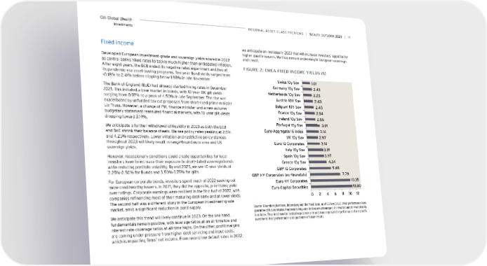 Citi Global Wealth reGioNAL ASSeT CLASS PreviewS | | 91 Investments Fixed income we anticipate an increase in 2023 that will increase investors’ appetite for higher quality issuers. We thus remain underweight European sovereign Developed European investment-grade and sovereign yields soared in 2022 and credit. as central banks hiked rates to tackle much higher-than-anticipated inflation. FiGUre 2: eMeA FiXeD iNCoMe YieLDS (%) After eight years, the ECB ended its negative rates experiment and two of its pandemic-era asset-buying programs. Ten-year Bund yields surged from -0.18% to 2.41% before slipping below 1.98% in late November. Swiss 10y Sov 1.01 The Bank of England (BoE) had already started hiking rates in December Germany 10y Sov 2.43 2021. This initiated a bear market in bonds, with 10-year UK gilt yields Netherlands 10y Sov 2.25 surging from 0.97% to a peak of 4.50% in late September. The rise was Austria 10Y Sov 2.43 exacerbated by unfunded tax cut proposals from short-lived prime minister Belgium 10Y Sov 2.45 Liz Truss. However, a change of PM, finance minister and a new autumn France 10y Sov 2.54 budgetary statement reassured financial markets, with 10-year gilt yields dropping toward 3.14%. Ireland 10y Sov 2.55 Portugal 10y Sov 3.91 We anticipate a further withdrawal of liquidity in 2023 as both the ECB Euro-Aggregate IG Index 3.14 and BoE shrink their balance sheets. We see policy rates peaking at 2.5% and 4.25% respectively. Lower inflation and restrictive policy stances UK 10y Sov 2.97 throughout 2023 will likely result in range-bound euro area and UK Euro IG Corporates 3.14 sovereign yields. Italy 10y Sov 3.91 However, recessionary conditions could create opportunities for local Spain 10y Sov 3.97 investors keen to increase their exposure to short-dated sovereign bonds Greece 10y Sov 4.24 while reducing portfolio volatility. By end 2023, we see 10-year yields at GBP IG Corporates 5.48 2.25%-2.50% for Bunds and 3.50%-3.75% for gilts. GBP HY Corporates (ex-financials) 7.79 For European corporate bonds, investors spent much of 2022 seeking out Euro HY Corporates 10.35 more creditworthy issuers. In 2021, they did the opposite, prioritizing yield Euro Capital Securities 10.80 over ratings. Corporate earnings were resilient in the first half of 2022, with companies refinancing most of their maturing debt early and at lower yields. 0 2 4 6 8 10 12 The second half was a different story in the European investment-grade market, amid a significant reduction in bond supply. Source: Bloomberg Barclays, Bloomberg and The Yield Book, as of 22 Nov 2022. Past performance is no guarantee of future returns. Real results may vary. Indices are unmanaged. An investor cannot invest directly We anticipate this trend will likely continue in 2023. On the one hand, in an index. They are shown for illustrative purposes only and do not represent the performance of any specific fundamentals remain positive, with leverage ratios at an all-time low and investment. Past performance is no guarantee of future results. interest rate coverage ratios at all-time highs. On the other, profit margins are coming under pressure from higher debt servicing and input costs, which is impacting firms’ net income. From record low default rates in 2022,