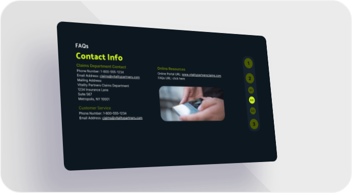 FAQs 1 Contact Info Claims Department Contact Online Resources Phone Number: 18005551234 Online Portal URL www.vitalitypartnersclaims.com 2 Email Address: [email protected] FAQs URL: click here Mailing Address: Vitality Partners Claims Department 2.1 1234 Insurance Lane Suite 567 2.2 Metropolis, NY 10001 Customer Service 2.3 Phone Number: 18005551234 Email Address: [email protected] 3