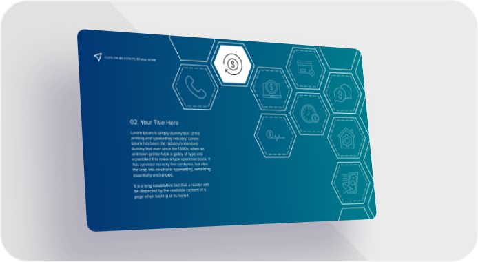 CLICK ON AN ICON TO REVEAL MORE 02. Your Title Here Lorem Ipsum is simply dummy text of the printing and typesetting industry. Lorem Ipsum has been the industry's standard dummy text ever since the 1500s, when an unknown printer took a galley of type and scrambled it to make a type specimen book. It has survived not only five centuries, but also the leap into electronic typesetting, remaining essentially unchanged. It is a long established fact that a reader will be distracted by the readable content of a page when looking at its layout.