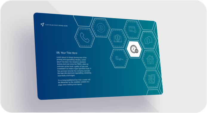 CLICK ON AN ICON TO REVEAL MORE 06. Your Title Here Lorem Ipsum is simply dummy text of the printing and typesetting industry. Lorem Ipsum has been the industry's standard dummy text ever since the 1500s, when an unknown printer took a galley of type and scrambled it to make a type specimen book. It has survived not only five centuries, but also the leap into electronic typesetting, remaining essentially unchanged. It is a long established fact that a reader will be distracted by the readable content of a page when looking at its layout.