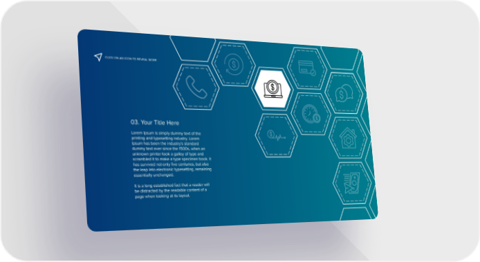 CLICK ON AN ICON TO REVEAL MORE 03. Your Title Here Lorem Ipsum is simply dummy text of the printing and typesetting industry. Lorem Ipsum has been the industry's standard dummy text ever since the 1500s, when an unknown printer took a galley of type and scrambled it to make a type specimen book. It has survived not only five centuries, but also the leap into electronic typesetting, remaining essentially unchanged. It is a long established fact that a reader will be distracted by the readable content of a page when looking at its layout.