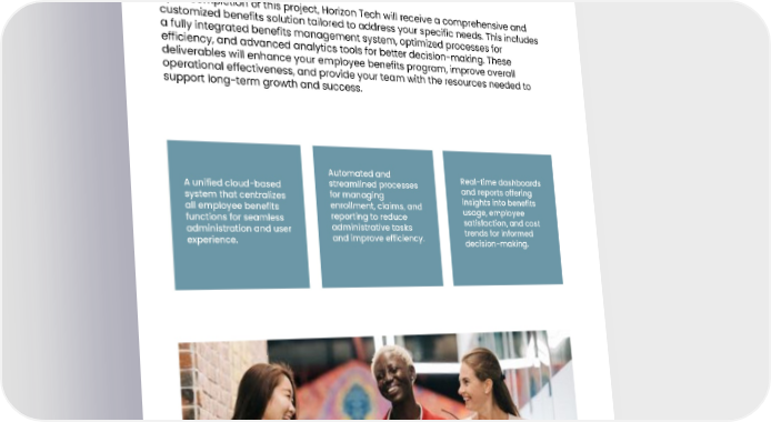 DELIVERABLES Upon completion of this project, Horizon Tech will receive a comprehensive and customized benefits solution tailored to address your specific needs. This includes a fully integrated benefits management system, optimized processes for efficiency, and advanced analytics tools for better decision-making. These deliverables will enhance your employee benefits program, improve overall operational effectiveness, and provide your team with the resources needed to support long-term growth and success. Automated and Real-time dashboards streamlined processes A unified cloud-based and reports offering for managing system that centralizes insights into benefits enrollment, claims, and all employee benefits usage, employee reporting to reduce functions for seamless satisfaction, and cost administrative tasks administration and user trends for informed and improve efficiency. experience. decision-making.
