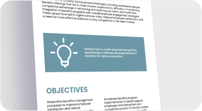 HOW WE HELP Horizon Tech is currently facing several challenges, including outdated employee benefits offerings that fail to meet modern expectations, difficulty in maintaining competitive advantage in attracting and retaining top talent, and insufficient integration of benefits programs with overall employee engagement strategies. These issues have led to higher turnover rates, reduced employee satisfaction, and a need for more effective solutions to stay competitive in the talent market. Horizon Tech is a mid-sized technology firm specializing in software development and IT solutions for various industries. OBJECTIVES Streamline benefits management Accelerate benefits program processes to improve employee implementation to better support satisfaction and reduce employees and strengthen your administrative costs. Enhance the competitive position in the job market. company’s overall employee benefits Integrate existing employee benefits capabilities to support future growth systems to enable seamless data flow and attract top talent. and enhance decision-making.