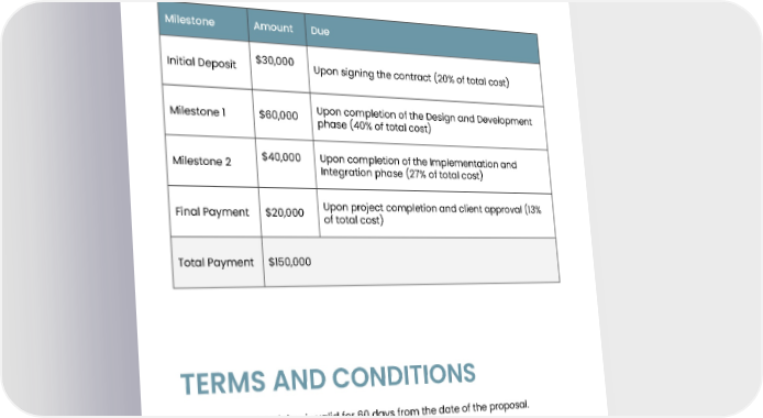 PAYMENT SCHEDULE Milestone Amount Due $30,000 Initial Deposit Upon signing the contract (20% of total cost) Upon completion of the Design and Development Milestone 1 $60,000 phase (40% of total cost) $40,000 Upon completion of the Implementation and Milestone 2 Integration phase (27% of total cost) Upon project completion and client approval (13% Final Payment $20,000 of total cost) Total Payment $150,000 TERMS AND CONDITIONS • Validity: This pricing is valid for 60 days from the date of the proposal. • Revisions: Any changes to the scope of work may result in additional costs, which will be agreed upon in writing before proceeding. • Payment Terms: Payments are due within 30 days of the invoice date. Late payments may incur a 1.5% monthly interest fee. • Termination: Either party may terminate the agreement with 30 days' written notice. In the event of termination, Horizon Tech will be responsible for payment of all completed work and any associated costs.