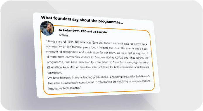 What founders say about the programmes... Jo Parker-Swift, CEO and Co-Founder Solivus “Being part of Tech Nation’s Net Zero 2.0 cohort not only gave us access to a community of like-minded peers, but it helped put us on the map. It was a huge moment of recognition and celebration for our team. We were part of a group of climate tech companies invited to Glasgow during COP26 and since joining the programme, we have successfully completed a Crowdfund campaign securing £2.4million to scale our thin-film solar solutions for both commercial and domestic customers. We have featured in many leading publications – and being selected for Tech Nation’s Net Zero 2.0 absolutely contributed to establishing our credibility as an ambitious and innovative tech scaleup.”