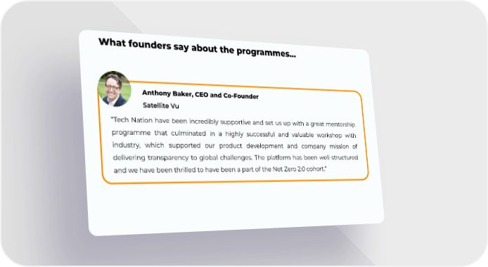 What founders say about the programmes... Anthony Baker, CEO and Co-Founder Satellite Vu “Tech Nation have been incredibly supportive and set us up with a great mentorship programme that culminated in a highly successful and valuable workshop with industry, which supported our product development and company mission of delivering transparency to global challenges. The platform has been well structured and we have been thrilled to have been a part of the Net Zero 2.0 cohort.”
