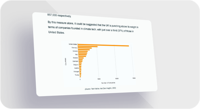 857,000 respectively. By this measure alone, it could be suggested that the UK is punching above its weight in terms of companies founded in climate tech, with just over a third (37%) of those in United States. (Source: Tech Nation, Net Zero Insights, 2022)