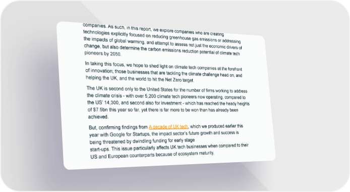 companies. As such, in this report, we explore companies who are creating technologies explicitly focused on reducing greenhouse gas emissions or addressing the impacts of global warming, and attempt to assess not just the economic drivers of change, but also determine the carbon emissions reduction potential of climate tech pioneers by 2050. In taking this focus, we hope to shed light on climate tech companies at the forefront of innovation; those businesses that are tackling the climate challenge head on, and helping the UK, and the world to hit the Net Zero target. The UK is second only to the United States for the number of firms working to address the climate crisis - with over 5,200 climate tech pioneers now operating, compared to the US’ 14,300, and second also for investment - which has reached the heady heights of $7.5bn this year so far, yet there is far more to be won than has already been achieved. But, confirming findings from A decade of UK tech, which we produced earlier this year with Google for Startups, the impact sector’s future growth and success is being threatened by dwindling funding for early stage start-ups. This issue particularly affects UK tech businesses when compared to their US and European counterparts because of ecosystem maturity,