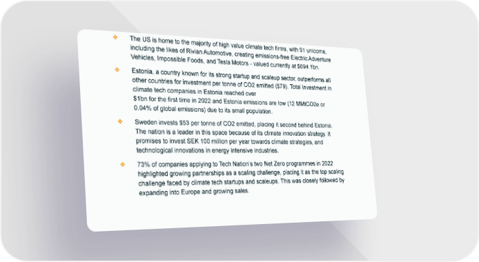 ❖ The US is home to the majority of high value climate tech firms, with 91 unicorns, including the likes of Rivian Automotive, creating emissions-free Electric Adventure Vehicles, Impossible Foods, and Tesla Motors - valued currently at $694.1bn. ❖ Estonia, a country known for its strong startup and scaleup sector, outperforms all other countries for investment per tonne of CO2 emitted ($79). Total investment in climate tech companies in Estonia reached over $1bn for the first time in 2022 and Estonia emissions are low (12 MMtCO2e or 0.04% of global emissions) due to its small population. ❖ Sweden invests $53 per tonne of CO2 emitted, placing it second behind Estonia. The nation is a leader in this space because of its climate innovation strategy. It promises to invest SEK 100 million per year towards climate strategies, and technological innovations in energy intensive industries. ❖ 73% of companies applying to Tech Nation’s two Net Zero programmes in 2022 highlighted growing partnerships as a scaling challenge, placing it as the top scaling challenge faced by climate tech startups and scaleups. This was closely followed by expanding into Europe and growing sales.