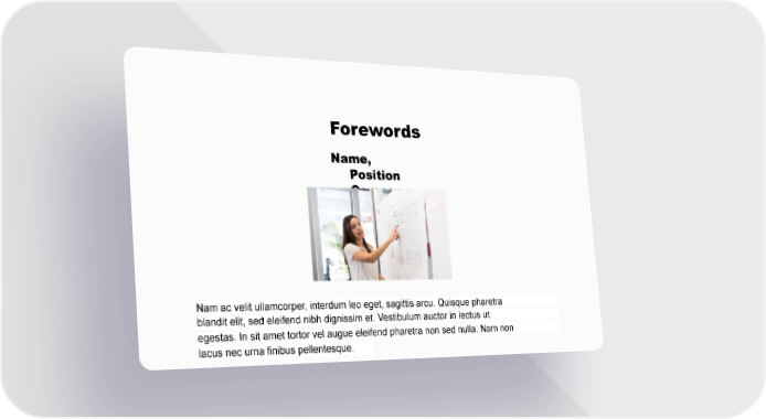 Forewords Name, Position Company Nam ac velit ullamcorper, interdum leo eget, sagittis arcu. Quisque pharetra blandit elit, sed eleifend nibh dignissim et. Vestibulum auctor in lectus ut egestas. In sit amet tortor vel augue eleifend pharetra non sed nulla. Nam non lacus nec urna finibus pellentesque.