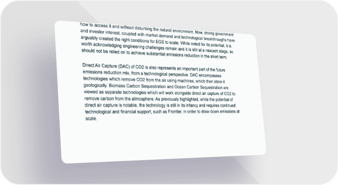how to access it and without disturbing the natural environment. Now, strong government and investor interest, coupled with market demand and technological breakthroughs have arguably created the right conditions for EGS to scale. While noted for its potential, it is worth acknowledging engineering challenges remain and it is still at a nascent stage, so should not be relied on to achieve substantial emissions reduction in the short term. Direct Air Capture (DAC) of CO2 is also represents an important part of the future emissions reduction mix, from a technological perspective. DAC encompasses technologies which remove CO2 from the air using machines, which then store it geologically. Biomass Carbon Sequestration and Ocean Carbon Sequestration are viewed as separate technologies which will work alongside direct air capture of CO2 to remove carbon from the atmosphere. As previously highlighted, while the potential of direct air capture is notable, the technology is still in its infancy and requires continued technological and financial support, such as Frontier, in order to draw down emissions at scale.