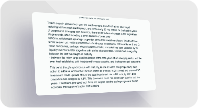 (Source: Tech Nation, Net Zero Insights, 2022) Trends seen in climate tech over the last five years, from 2017 mirror other rapid maturing sectors such as deeptech, and in the early 2010s, fintech. In the first five years of progressive emerging tech evolution, there tends to be an increase in the largest late stage rounds, often including a small number of deals over $250mn, which make up a high proportion of the total investment figure. This trend then tends to even out - with a proliferation of mid-stage investments, between Series B and C; those companies, perhaps, whose business model, or market has been validated by the liquidity event of a later stage firm with similar characteristics. Climate tech is arguably between the last two stages of maturity - between the noisy, large deal landscape of the teen years of an emerging sector, and the even keel established with heightened investor appetite, and the beginning of exit activity. This trend, though synchronous with maturity, is one to watch and prospectively take action to address. Across the UK tech sector as a whole, in 2011 seed and pre-seed VC investment made up over 15% of the total investment mix in UK tech, by 2021 that proportion had dropped to 4.8%. This downward trend has been seen over the last four years. If seed and pre-seed tech firms are to grow into the scaling engines of the UK economy, the supply of capital that sustains