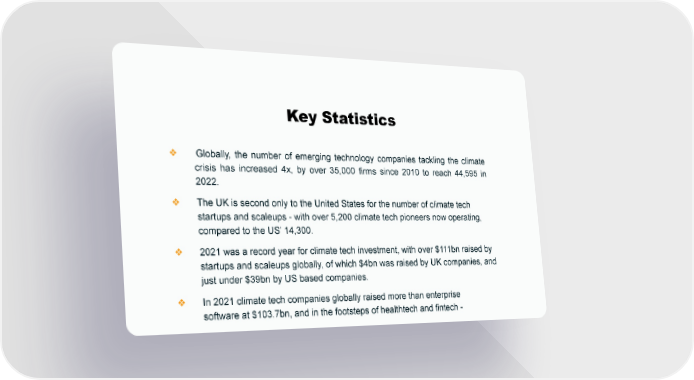 Key Statistics ❖ Globally, the number of emerging technology companies tackling the climate crisis has increased 4x, by over 35,000 firms since 2010 to reach 44,595 in 2022. ❖ The UK is second only to the United States for the number of climate tech startups and scaleups - with over 5,200 climate tech pioneers now operating, compared to the US’ 14,300. ❖ 2021 was a record year for climate tech investment, with over $111bn raised by startups and scaleups globally, of which $4bn was raised by UK companies, and just under $39bn by US based companies. ❖ In 2021 climate tech companies globally raised more than enterprise software at $103.7bn, and in the footsteps of healthtech and fintech -