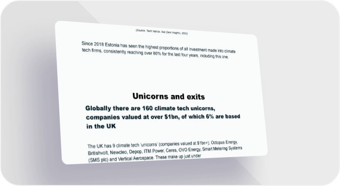 (Source: Tech Nation, Net Zero Insights, 2022) Since 2018 Estonia has seen the highest proportions of all investment made into climate tech firms, consistently reaching over 80% for the last four years, including this one. Unicorns and exits Globally there are 160 climate tech unicorns, companies valued at over $1bn, of which 6% are based in the UK The UK has 9 climate tech ‘unicorns’ (companies valued at $1bn+); Octopus Energy, Britishvolt, Newcleo, Depop, ITM Power, Ceres, OVO Energy, Smart Metering Systems (SMS plc) and Vertical Aerospace. These make up just under