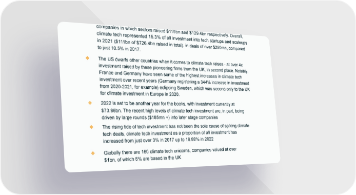 companies in which sectors raised $119bn and $129.4bn respectively. Overall, climate tech represented 15.3% of all investment into tech startups and scaleups in 2021 ($111bn of $726.4bn raised in total). in deals of over $250mn, compared to just 10.5% in 2017. ❖ The US dwarfs other countries when it comes to climate tech raises - at over 4x investment raised by these pioneering firms than the UK, in second place. Notably, France and Germany have seen some of the highest increases in climate tech investment over recent years (Germany registering a 344% increase in investment from 2020-2021, for example) eclipsing Sweden, which was second only to the UK for climate investment in Europe in 2020. ❖ 2022 is set to be another year for the books, with investment currently at $73.86bn. The recent high levels of climate tech investment are, in part, being driven by large rounds ($185mn +) into later stage companies ❖ The rising tide of tech investment has not been the sole cause of spiking climate tech deals, climate tech investment as a proportion of all investment has increased from just over 3% in 2017 up to 16.88% in 2022 ❖ Globally there are 160 climate tech unicorns, companies valued at over $1bn, of which 6% are based in the UK