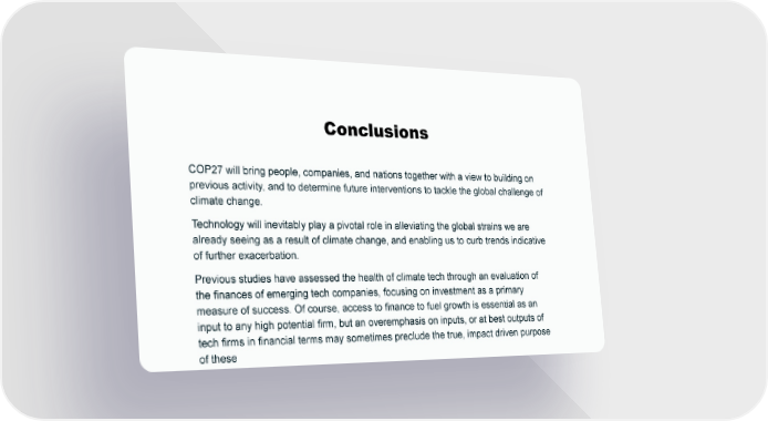 Conclusions COP27 will bring people, companies, and nations together with a view to building on previous activity, and to determine future interventions to tackle the global challenge of climate change. Technology will inevitably play a pivotal role in alleviating the global strains we are already seeing as a result of climate change, and enabling us to curb trends indicative of further exacerbation. Previous studies have assessed the health of climate tech through an evaluation of the finances of emerging tech companies, focusing on investment as a primary measure of success. Of course, access to finance to fuel growth is essential as an input to any high potential firm, but an overemphasis on inputs, or at best outputs of tech firms in financial terms may sometimes preclude the true, impact driven purpose of these
