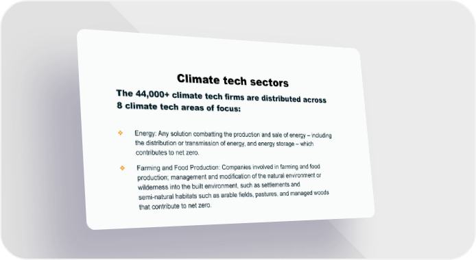 Climate tech sectors The 44,000+ climate tech rms are distributed across 8 climate tech areas of focus: ❖ Energy: Any solution combatting the production and sale of energy – including the distribution or transmission of energy, and energy storage – which contributes to net zero. ❖ Farming and Food Production: Companies involved in farming and food production; management and modification of the natural environment or wilderness into the built environment, such as settlements and semi-natural habitats such as arable fields, pastures, and managed woods that contribute to net zero.