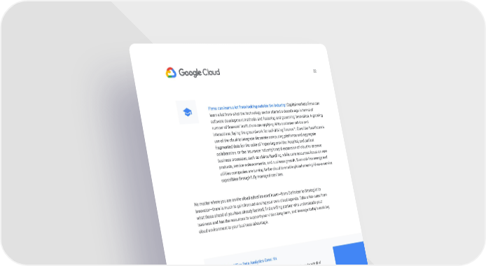 22 Firms can learn a lot from looking outside the industry: Capital markets firms can learn a lot from what the technology sector started a decade ago in terms of software development methods and fostering and governing innovation. A growing number of financial institutions are applying AI to customer advice and 14 interactions, laying the groundwork for self-driving finance . Consider healthcare’s use of the cloud to integrate disparate computing platforms and aggregate fragmented data for the sake of improving provider, hospital, and patient collaboration. Or the insurance industry’s rapid expansion of cloud to improve business processes, such as claims handling, while core resources focus on new products, service enhancements, and business growth. Even old-line energy and utilities companies are turning to the cloud to enable global smart-grid-as-a-service capabilities through fully managed services. No matter where you are on the cloud adoption continuum—from Optimizer to Strategist to Innovator—there is much to gain from advancing your own cloud agenda. Take a few cues from what those ahead of you have already learned, find a willing partner who understands your business and has the resources to support your vision long-term, and leverage today’s evolving cloud environment to your business advantage. The Front Office Data Analytics Case: Kx • Overview: In-memory, time-series database technology provider Kx works with all of the main cloud providers. • The driver: The rising pressure to store high volumes of data over time creates a real desire to reduce TCO for storing decades’ worth of information. • The result: Once in the cloud, firms acquire an unlimited amount of technology power to develop new classes of applications for market data and compliance activities. “To help with the data migration, Google Cloud offers tools for data ingestion. It also owns significant infrastructure, which is important to investment banks that manage data in a lot of regions, especially in light of regulations, such as GDPR,”- Glenn Wright, Systems Architect, Kx