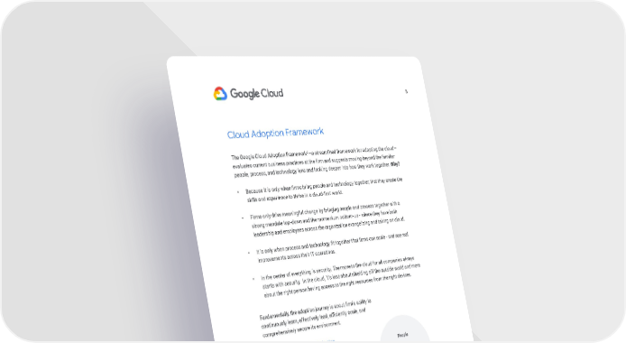 5 Cloud Adoption Framework 2 The Google Cloud Adoption Framework —a streamlined framework for adopting the cloud— evaluates current business practices at the firm and suggests moving beyond the familiar people, process, and technology lens and looking deeper into how they work together. Why? • Because it is only when firms bring people and technology together, that they create the skills and experience to thrive in a cloud-first world. • Firms only drive meaningful change by bringing people and process together with a strong mandate top-down and the momentum bottom-up - where they have both leadership and employees across the organization evangelizing and taking on cloud. • It is only when process and technology fit together that firms can scale - and see real improvements across their IT operations. • In the center of everything is security. The move to the cloud for all companies always starts with security. In the cloud, it’s less about shielding off the outside world and more about the right person having access to the right resources from the right devices. Fundamentally, the adoption journey is about firm's ability to continuously learn, effectively lead, efficiently scale, and comprehensively secure its environment. Figure 1. The Google Cloud Adoption Framework - learn, lead, scale, and secure People Learn Lead Secure Technology Process Scale 2https://services.google.com/fh/files/misc/adoption_framework_whitepaper_nov12_final.pdf