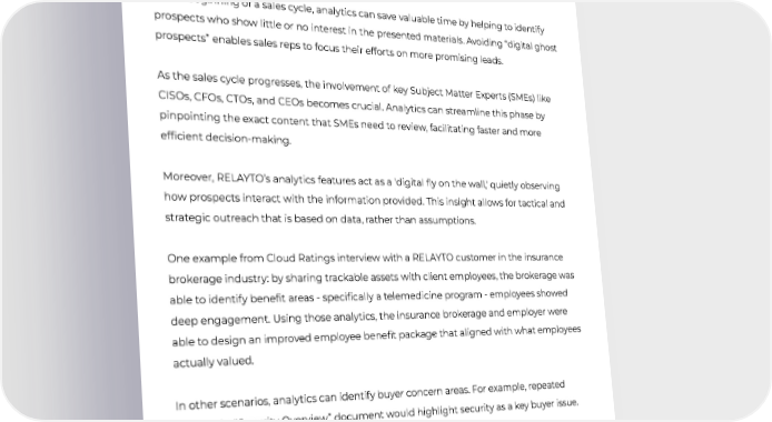 ROIDriver#4:SalesRepresentativeTimeSavingsViaAnalytics RELAYTO'sengagementanalyticsprovidereal-timeinsightsintohowusersinteractwith eachdocument,page,andassetintheDigitalSalesRoom. Atthebeginningofasalescycle,analyticscansavevaluabletimebyhelpingtoidentify prospectswhoshowlittleornointerestinthepresentedmaterials.Avoiding“digitalghost prospects”enablessalesrepstofocustheireffortsonmorepromisingleads. Asthesalescycleprogresses,theinvolvementofkeySubjectMatterExperts(SMEs)like CISOs,CFOs,CTOs,andCEOsbecomescrucial.Analyticscanstreamlinethisphaseby pinpointingtheexactcontentthatSMEsneedtoreview,facilitatingfasterandmore efficient decision-making. Moreover,RELAYTO’sanalyticsfeaturesactasa'digitalflyonthewall,'quietlyobserving howprospectsinteractwiththeinformationprovided.Thisinsightallowsfortacticaland strategic outreach that is based on data, rather than assumptions. OneexamplefromCloudRatingsinterviewwithaRELAYTOcustomerintheinsurance brokerageindustry:bysharingtrackableassetswithclientemployees,thebrokeragewas abletoidentifybenefitareas-specificallyatelemedicineprogram-employeesshowed deepengagement.Usingthoseanalytics,theinsurancebrokerageandemployerwere abletodesignanimprovedemployeebenefitpackagethatalignedwithwhatemployees actually valued. In other scenarios, analytics can identify buyer concern areas. For example, repeated opensofa“SecurityOverview”documentwouldhighlightsecurityasakeybuyerissue. 8
