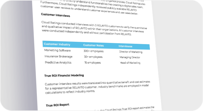 TrueROIMethodologySummary: ProductDueDiligence CloudRatingsconductedinterviewswithRELAYTOrepresentativesandreviewedvendor informational resources to inform our customer due diligence process. Cloud Ratings also trialed RELAYTOtodirectlyunderstandfunctionalitieslikecreatingadigitalsalesroom. Furthermore,CloudRatingsindependentlyreviewedpubliclyavailableRELAYTO customeruserreviewstounderstandcustomerexperiencesandusecasesbetter. CustomerInterviews CloudRatingsconductedinterviewswith3RELAYTOcustomerstoverifythequantitative andqualitativeimpactofRELAYTOwithintheirorganizations.Allcustomerinterviews wereconductedindependentlyandwithoutparticipationfromRELAYTO. CustomerIndustry CustomerNotes Interviewee MarketingSoftware 300+employees Director of Marketing InsuranceBrokerage 30+employees ManagingDirector Predictive Analytics 15 employees HeadofMarketing TrueROIFinancialModeling Customerinterviewresultsweretranslatedintoquantitativebenefitandcostestimates for a representative RELAYTO customer.Industrybenchmarksareemployedinmodel calculations to reflect industry norms. TrueROIReport Basedonverifiedcustomerinformation,theCloudRatingsTrueROIreportestimatesthe financialimpactofadoptingRELAYTO.Forpurposesofconservatism,qualitativebenefits arenotincludedinCloudRatings’estimatesofROIorpaybackperiod. 11
