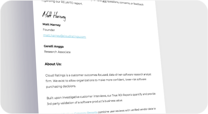 TrueROIReportAuthors: Accountability and accessibility are core values of Cloud Ratings. Pleasedonothesitatetocontactusifyouhaveanyquestions,concerns,orfeedback regardingourRELAYTOreport. MattHarney Founder [email protected] Gerelli Angga ResearchAssociate AboutUs: CloudRatingsisacustomeroutcomes-focused,data-drivensoftwareresearchanalyst firm.Weexisttoalloworganizationstomakemoreconfident,lower-risksoftware purchasingdecisions. Built uponinvestigative customerinterviews, our True ROI Reports quantify and provide 3rdpartyvalidationofasoftwareproduct’sbusinessvalue. OurCloudRatingsCategoryReportscombineuserreviewswithverifiedvendordatato impartially identify leading software products. cloudratings.com 12