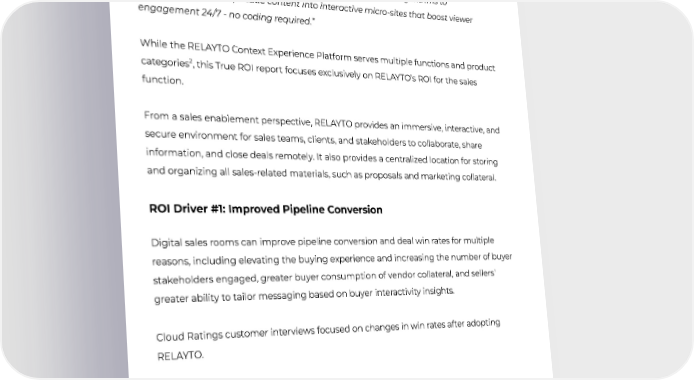 Solution Overview: RELAYTO’sOfficialDescription:“RELAYTOengagesadvancedalgorithmsto automaticallyrevampstaticcontentintointeractivemicro-sitesthatboostviewer engagement24/7-nocodingrequired.” WhiletheRELAYTOContextExperiencePlatformservesmultiplefunctionsandproduct 2 categories , this True ROI report focuses exclusively on RELAYTO’s ROI for the sales function. Fromasalesenablementperspective,RELAYTOprovidesanimmersive,interactive,and secureenvironmentforsalesteams,clients,andstakeholderstocollaborate,share information, and close deals remotely. It also provides a centralized location for storing andorganizingallsales-relatedmaterials,suchasproposalsandmarketingcollateral. ROIDriver#1:ImprovedPipelineConversion Digital sales rooms can improve pipeline conversion and deal win rates for multiple reasons, including elevating the buying experience and increasing the number of buyer stakeholdersengaged,greaterbuyerconsumptionofvendorcollateral,andsellers' greater ability to tailor messaging based on buyer interactivity insights. CloudRatingscustomerinterviewsfocusedonchangesinwinratesafteradopting RELAYTO. 2 SoftwarecategoriesservedbyRELAYTOinclude:ContentExperience,ContentDistribution,Content Analytics, Account BasedMarketing,Flipbook,Presentation,ContentCreation,Proposal,SalesEnablement, andDigitalSalesRoom 2