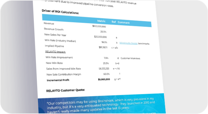 ARELAYTOcustomerexperienceda750basispointincreaseintheirwinratesolelyfrom deals that skipped the RFP process altogether. Relative to their pre-RELAYTO win rate (whichwasmodestlyaboveindustrymedians),thisrepresenteda29%increase. Anothercustomerattributed35%(orhalf)oftheir70%post-RELAYTOrevenue improvementduetoimprovedpipelineconversionrates. Driver of ROI Calculations: Metric Ref Comment Revenue $100,000,000 RevenueGrowth 20.0% NewSalesPerYear $20,000,000 a WinRate(IndustryMedian) 18.0% b WinningByDesignbenchmarks ImpliedPipeline $111,111,111 c=a/b RELAYTOImpact: WinRateImprovement 7.5% d Customerinterviews NewWinRate 25.5% b+d Sales fromImprovedWinRate $8,333,333 e=c*d NewSaleContributionMargin 60.0% f IncrementalProfit $5,000,000 g=e*f RELAYTOCustomerQuote: 3