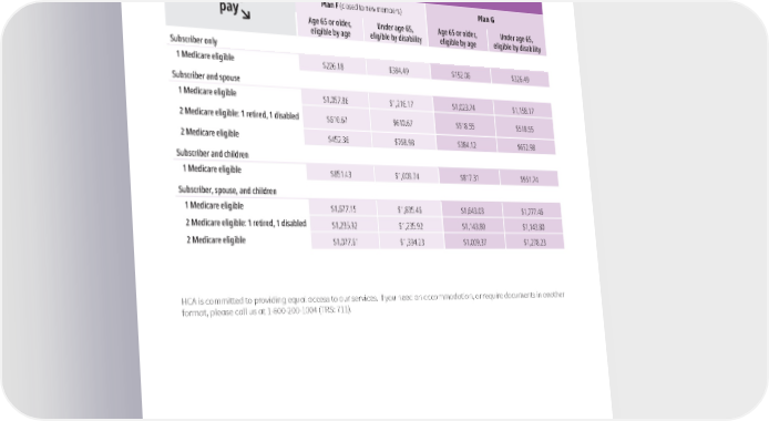 Medicare supplement plan premiums If a Medicare supplement plan is elected, non-Medicare members are enrolled in UMP Classic. The rates shown re昀氀ect the total due, including premiums for both plans. Note: These Medicare premiums do not include your Medicare Part B premium. Premera Blue Cross What you Plan F (closed to new members) Plan G pay Age 65 or older, Under age 65, Age 65 or older, Under age 65, ̸̣ eligible by age eligible by disability eligible by age eligible by disability Subscriber only 1 Medicare eligible $226.18 $384.49 $192.06 $326.49 Subscriber and spouse 1 Medicare eligible $1,057.86 $1,216.17 $1,023.74 $1,158.17 2 Medicare eligible: 1 retired, 1 disabled $610.67 $610.67 $518.55 $518.55 2 Medicare eligible $452.36 $768.98 $384.12 $652.98 Subscriber and children 1 Medicare eligible $851.43 $1,009.74 $817.31 $951.74 Subscriber, spouse, and children 1 Medicare eligible $1,677.15 $1,835.46 $1,643.03 $1,777.46 2 Medicare eligible: 1 retired, 1 disabled $1,235.92 $1,235.92 $1,143.80 $1,143.80 2 Medicare eligible $1,077.61 $1,394.23 $1,009.37 $1,278.23 HCA is committed to providing equal access to our services. If you need an accommodation, or require documents in another format, please call us at 1-800-200-1004 (TRS: 711). 3