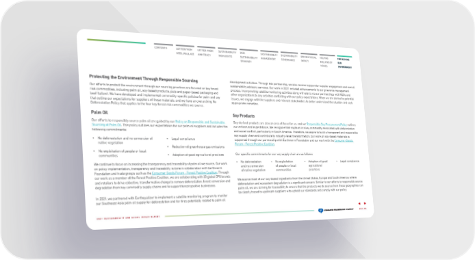 CONTENTS LETTER FROM NOEL WALLACE LETTER FROM ANN TRACY 2025 SUSTAINABILITY STRATEGY SUSTAINABILITY HIGHLIGHTS SUSTAINABILITY MANAGEMENT SUSTAINABILITY GOVERNANCE DRIVING SOCIAL IMPACT HELPING MILLIONS OF HOMES PRESERVING OUR ENVIRONMENT Protecting the Environment Through Responsible Sourcing Our efforts to protect the environment through our sourcing practices are focused on key forest risk commodities, including palm oil, soy-based products, pulp and paper-based packaging and beef (tallow). We have developed and implemented commodity-specific policies for palm and soy that outline our expectations for suppliers of these materials, and we have an overarching No Deforestation Policy that applies to the four key forest risk commodities we source. P alm Oil Our efforts to responsibly source palm oil are guided by our Policy on Responsible and Sustainable Sourcing of Palm Oil . Th is policy outlines our expectations for our palm oil suppliers and includes the following commitment s: • N o deforestation and no conversion of native vegetation • No exploitation of people or local communities • Legal compl iance • Reduction of greenhouse gas emissions • Adoption of good agricultural practices We continue to focus on increasing the transparency and traceability of palm oil we source. Our work on policy implementation, transparency and traceability is done in collaboration with Earthworm Foundation and trade groups such as the Consumer Goods Forum - Forest Positive Coalition . Through our work as a member of the Fo rest Positive Coalition, we are collaborating with 20 global CPG brands and retailers to drive collective, transformative change to remove deforestation, forest conversion and degradation from key commodity supply chains and to support forest-positive businesses. In 2021, we partnered with Earthqualizer to implement a satellite monitoring program to monitor our Southeast Asia pal m oil supply for deforestation and for fires potentially related to palm oil d evelopment activities. Through this partnership, we also receive support for supplier engagement and overall sustainability adv isory services. Our work in 2021 included enhancements to our grievance management process, incorporating satellite monitoring activities along with alerts via our partnerships with NGOs and other organizations to any activities conflicting with our policy expectations. When we are alerted to potential issues, we engage with the suppliers and relevant stakeholders to better understand the situation and seek appropriate remedies. Soy Products S oy-derived products are also an area of focus for us, and our Responsible Soy Procurement Policy outlines our actions and expect ations. We recognize that soybean is a key commodity associated with deforestation and social conflict, particularly in South America. Therefore, we aspire to build a transparent and responsible soy supply chain and contribute to industry-level transformation. Our work on soy-based materials is supported through our partnership with Earthworm Foundation and our work with the Consumer Goods Forum - Forest Positive Coalition . Our specific commitments for our soy supply chain are as follows: • N o deforestation and no conversion of nat ive vegetation • No exploitation of people or local communiti es • Adoption of good agricultural practice s • Legal compliance We source most of our soy-based ingredients from the United States, Europe and South America, where d eforestation and ecosystem degradation is a significant concern. Similar to our efforts to responsibly source palm oil, we are striving for traceability to ensure that the products we do source from those geographies can be clearly traced to upstream suppliers who uphold our standards and comply with our policy. PAGE 82 2021 SUSTAINABILITY AND SOCIAL IMPACT REPORT